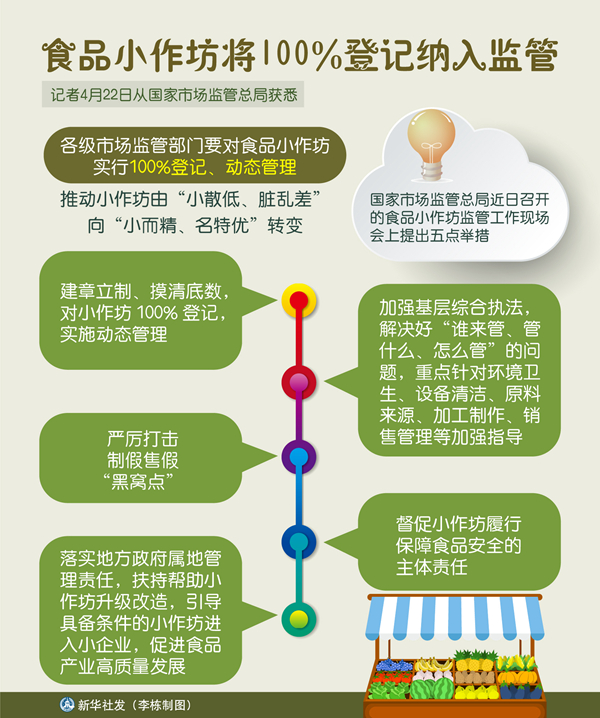 新華社北京4月22日電(記者趙文君)記者22日從國(guó)家市場(chǎng)監(jiān)管總局獲悉,各級(jí)市場(chǎng)監(jiān)管部門(mén)要對(duì)食品小作坊實(shí)行100%登記、動(dòng)態(tài)管理,推動(dòng)小作坊由“小散低、臟亂差”向“小而精、名特優(yōu)”轉(zhuǎn)變。
