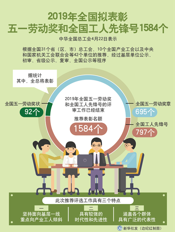 新華社北京4月22日電(記者樊曦)中華全國總工會22日表示,根據(jù)全國31個(gè)省(區(qū)、市)總工會、10個(gè)全國產(chǎn)業(yè)工會以及中央和國家機(jī)關(guān)工會聯(lián)合會等42個(gè)單位的推薦,經(jīng)過基層單位公示、初審、省級公示、復(fù)審、全國公示等程序,2019年全國五一勞動獎和全國工人先鋒號的評審工作已經(jīng)結(jié)束,推薦表彰名額1584個(gè)。