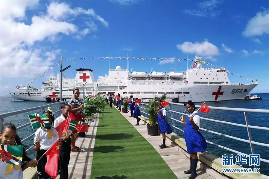 2018年10月12日,在多米尼克首都羅索,當(dāng)?shù)貙W(xué)生揮動(dòng)多中兩國(guó)國(guó)旗歡迎中國(guó)海軍和平方舟醫(yī)院船首次到訪。新華社發(fā)(江山 攝)