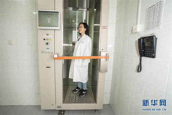 在中核集團(tuán)中國(guó)原子能科學(xué)研究院,媒體記者在參觀完中國(guó)先進(jìn)研究堆后,都要經(jīng)過(guò)一個(gè)特別的安檢門,通過(guò)檢測(cè)確定沒有受到輻射污染才能夠離開(4月17日攝)。新華社記者 才揚(yáng) 攝