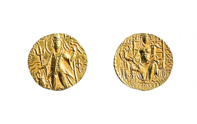 貴霜帝國(guó)伽膩色迦三世金幣 貴霜帝國(guó)伽膩色迦三世時(shí)期(約公元250—270年)鑄造,重7.9克、直徑21.5毫米 中國(guó)錢(qián)幣博物館藏