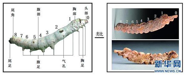 這是河南鞏義雙槐樹遺址出土的牙雕蠶與現(xiàn)代家蠶的比對(duì)圖(資料照片)。新華社發(fā)(鄭州市文物考古研究院提供)