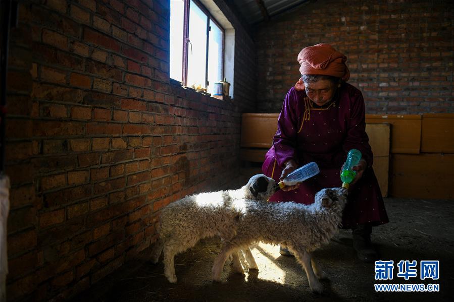 內蒙古自治區(qū)新巴爾虎左旗甘珠爾蘇木伊和呼熱嘎查牧民斯布格道爾吉給小羊羔喂奶(4月10日攝)。新華社記者 彭源 攝