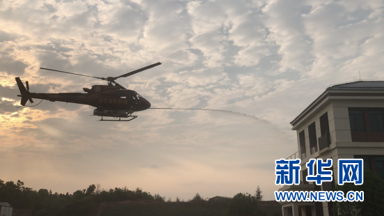 圖為消防直升機對著火建筑進行滅火水劑噴射。新華網(wǎng) 黃浩攝