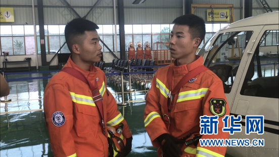 圖為消防員(左唐運德,右李金地)進行演練后經(jīng)驗交流。新華網(wǎng) 黃浩 攝
