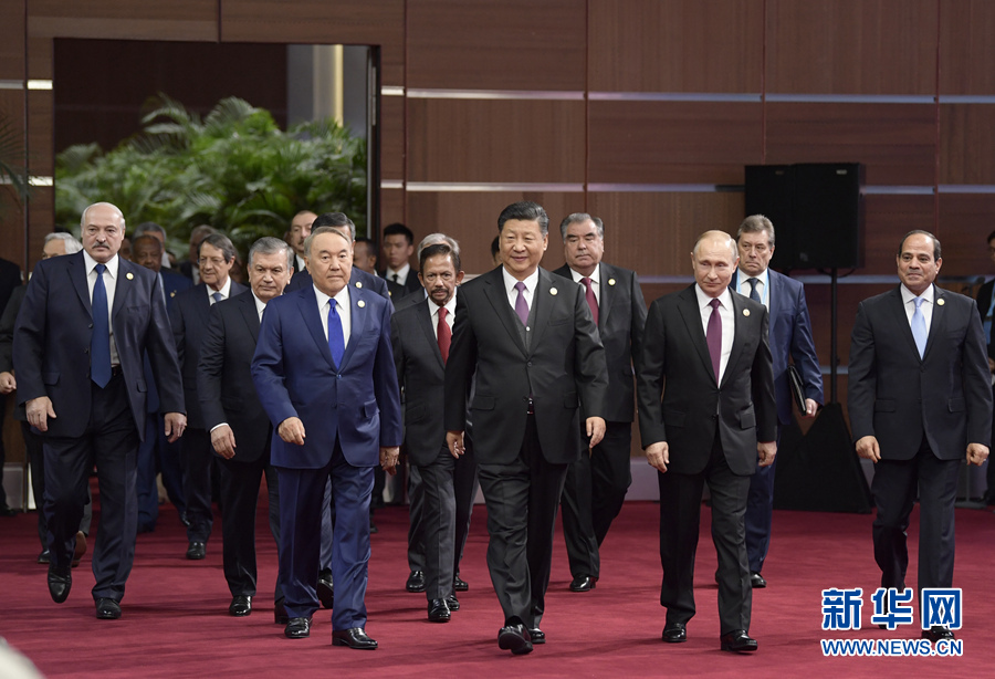 4月26日,國(guó)家主席習(xí)近平在北京出席第二屆“一帶一路”國(guó)際合作高峰論壇開幕式,并發(fā)表題為《齊心開創(chuàng)共建“一帶一路”美好未來》的主旨演講。這是習(xí)近平和出席開幕式的外方領(lǐng)導(dǎo)人共同步入會(huì)場(chǎng)。 新華社記者李學(xué)仁攝