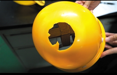 15元安全帽測試后現(xiàn)破洞。新京報記者 唐躍 攝