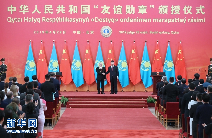 新華社北京4月28日電(記者白潔、馬巖)國家主席習(xí)近平28日在人民大會堂中央大廳為哈薩克斯坦首任總統(tǒng)納扎爾巴耶夫舉行“友誼勛章”頒授儀式。