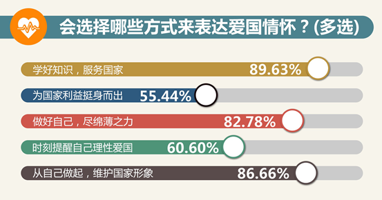 大學(xué)生表達(dá)愛國的方式更加務(wù)實,94.03%的受訪者認(rèn)為“理性愛國是最好的方式”。超過80%的大學(xué)生認(rèn)為愛國要先從自己做起,“學(xué)好知識、服務(wù)國家”“做好自己,為社會盡綿薄之力”等成為很多大學(xué)生的首選。陜西師范大學(xué)學(xué)生強(qiáng)德平說,愛國有三點,第一是銘記歷史,第二是展望未來,第三是把握當(dāng)下。中國人民大學(xué)學(xué)生張嘯寒說,走到人民生產(chǎn)實踐的第一線,是關(guān)心國家和社會的最好方式。
