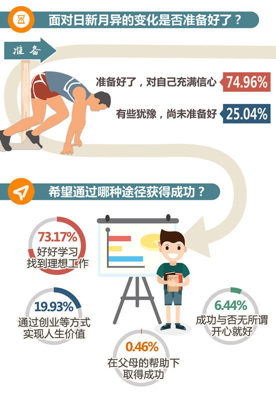 大學(xué)生的自信還體現(xiàn)在希望通過努力獲得成功。93.1%的受訪者希望“好好學(xué)習(xí),從事理想工作”“通過創(chuàng)新、創(chuàng)業(yè)等方式實現(xiàn)人生價值”。在采訪中,不少大學(xué)生表示“只要有想法就敢去做”“相信未來有無限可能”。中國地質(zhì)大學(xué)(北京)信息工程學(xué)院兼職輔導(dǎo)員王洪宇說,現(xiàn)在的大學(xué)生不拘泥于傳統(tǒng),更愿意參與創(chuàng)新創(chuàng)業(yè),他們甚至?xí)约簞?chuàng)立新工種,把青年特質(zhì)發(fā)揮到極致。分析認(rèn)為,這一代大學(xué)生成長在國家快速發(fā)展、改革開放不斷深化、國際地位不斷上升、互聯(lián)網(wǎng)與生活緊密融合的時代,他們的成長環(huán)境更加優(yōu)越,視野更加開闊,這對他們的自我認(rèn)知及性格形成有很大影響,他們更加自信。
