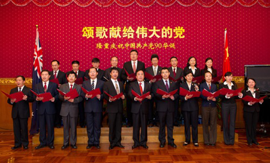 2011年7月1日,在澳大利亞首都堪培拉,中國駐澳大利亞大使陳育明(前中)與館員們合唱歌曲《我和我的祖國》。當(dāng)日,中國駐澳大利亞大使館舉辦“頌歌獻(xiàn)給偉大的黨”活動(dòng),慶祝中國共產(chǎn)黨建黨90周年。 新華社發(fā)(白雪攝)