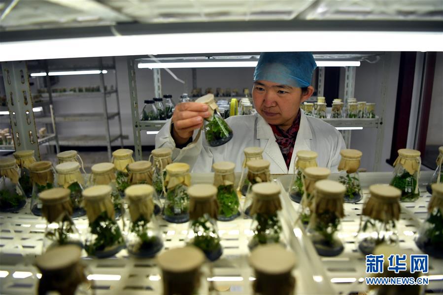 工作人員在洛陽(yáng)國(guó)家牡丹園組織培養(yǎng)室中觀察牡丹組織培養(yǎng)苗生長(zhǎng)情況(4月24日攝)。新華社記者 李嘉南 攝