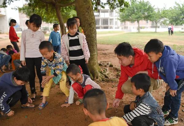 支教老師(右二)在課間和學生一起玩游戲。鄧華 攝