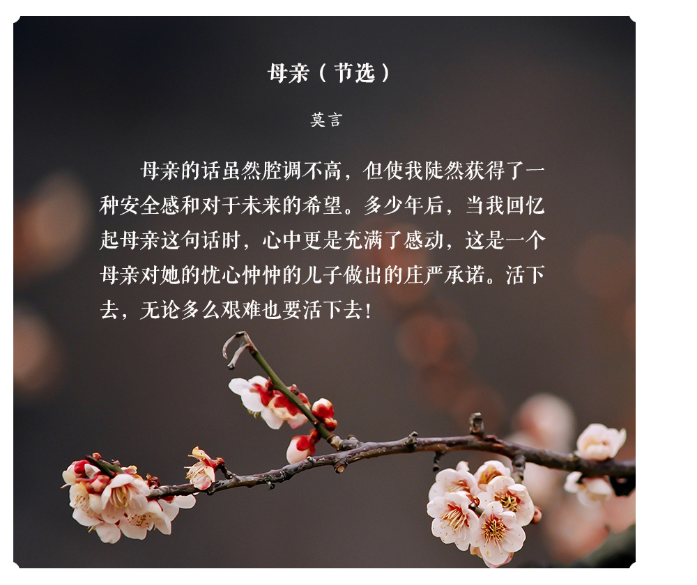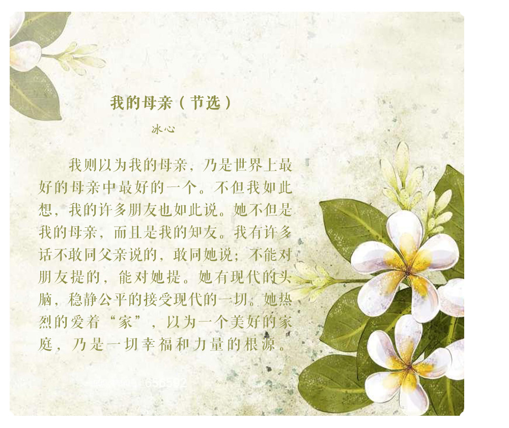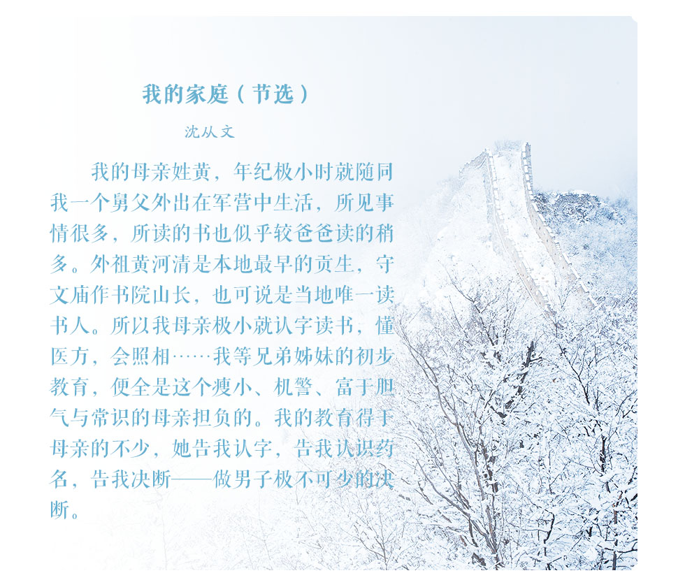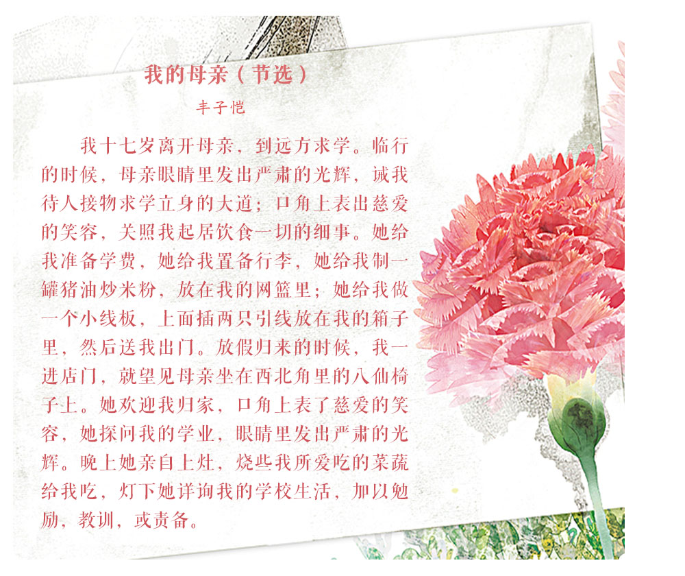 人們常說“嚴(yán)父慈母”,父愛總是如山般深厚內(nèi)斂,而母愛則如水般細(xì)膩溫柔?!芭R行密密縫,意恐遲遲歸”,母親從不用華麗的辭藻訴說她們的愛,而是默默將其融入生活的一點一滴;“月明聞杜宇,南北總關(guān)心”,一切遠(yuǎn)行的出發(fā)點總是與母親告別,但兒行千里母擔(dān)憂,我們從未離開過母親的牽掛——孩子走到哪里,母親的心就跟到哪里。然而母親的偉大,不僅在于她給予我們生命和愛,更因她讓我們從頑愚走向睿智,教會我們應(yīng)以怎樣的方式立身于天地之間。讓我們一起走進(jìn)老舍、沈從文等名家的回憶中,回望他們身后慈祥的母親,感受動人的母愛。