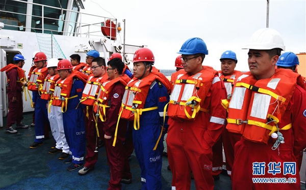 5月19日,科考隊員在甲板集合準(zhǔn)備登上救生艇。新華社記者 張旭東 攝