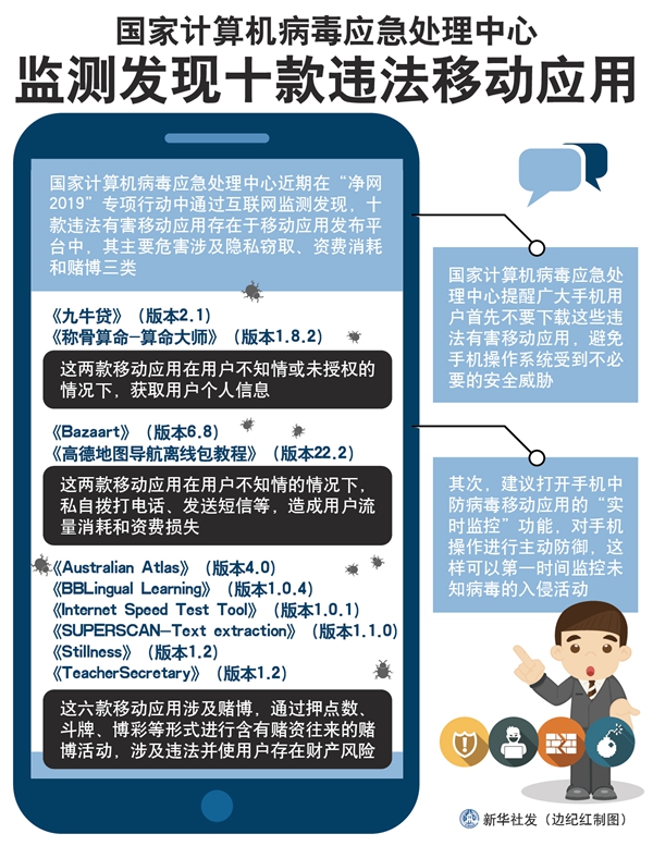 新華社天津5月28日電(記者張建新)國家計算機(jī)病毒應(yīng)急處理中心近期在“凈網(wǎng)2019”專項行動中通過互聯(lián)網(wǎng)監(jiān)測發(fā)現(xiàn),十款違法有害移動應(yīng)用存在于移動應(yīng)用發(fā)布平臺中,其主要危害涉及隱私竊取、資費消耗和賭博三類。