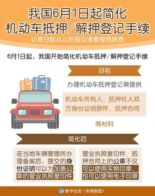 新華社北京5月28日電(記者王茜)6月1日起,我國開始簡化機(jī)動(dòng)車抵押/解押登記手續(xù)。這是記者日前從公安部交通管理局獲悉的。