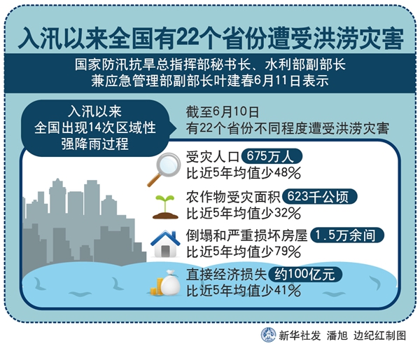 截至6月10日,農(nóng)作物受災(zāi)面積623千公頃,比近5年均值少32%;倒塌和嚴(yán)重?fù)p壞房屋1.5萬余間,比近5年均值少79%;直接經(jīng)濟(jì)損失約100億元,比近5年均值少41%。