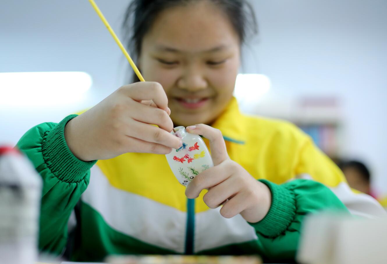 近年來,河北省衡水市珍寶街小學將當?shù)氐膰壹壏俏镔|(zhì)文化遺產(chǎn)項目衡水內(nèi)畫引入校園,開設校本課程,并成立“內(nèi)畫工藝坊”興趣社團,在豐富校園文化生活的同時,讓學生們近距離感受非遺的魅力,弘揚和傳承傳統(tǒng)文化。
