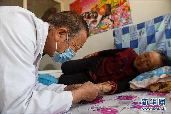 6月7日,在哈彥陶勒蓋自然村,韓四虎準備為76歲的榮花桃輸液。新華社記者 劉磊 攝