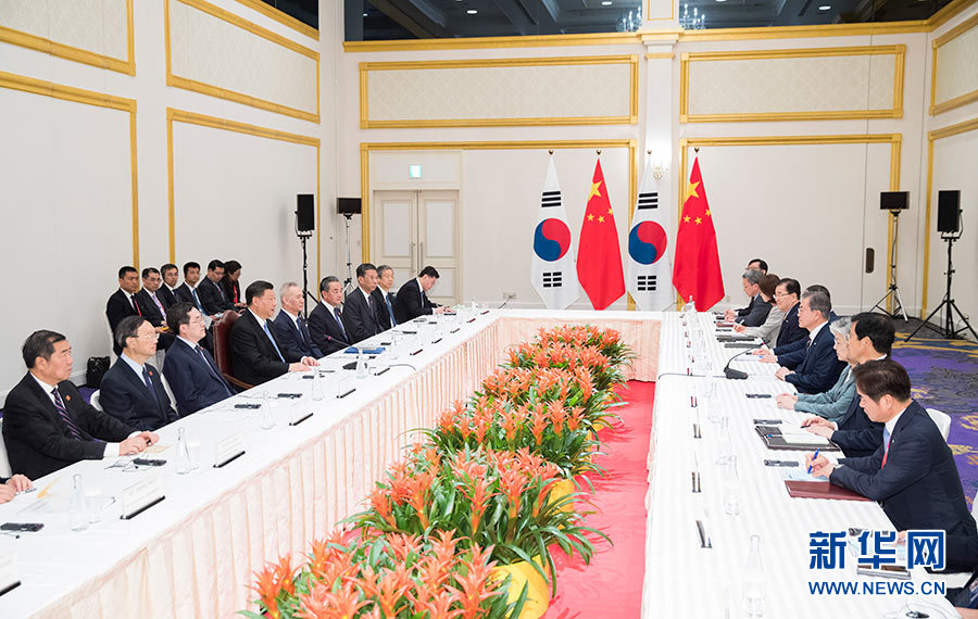 6月27日,國家主席習(xí)近平在日本大阪會見韓國總統(tǒng)文在寅。 新華社記者 黃敬文 攝
