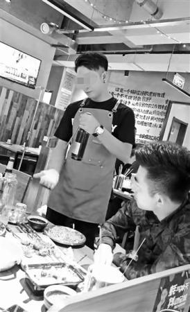 北青報(bào)記者在其中一則視頻中看到,一名餐廳服務(wù)人員當(dāng)著一桌食客掏出一根準(zhǔn)備好的筷子,左手持酒瓶,右手將筷子的一端頂住啤酒瓶蓋并換至左手扶穩(wěn),然后右手手掌一推,瓶蓋隨即崩開,整個(gè)過程僅幾秒鐘。