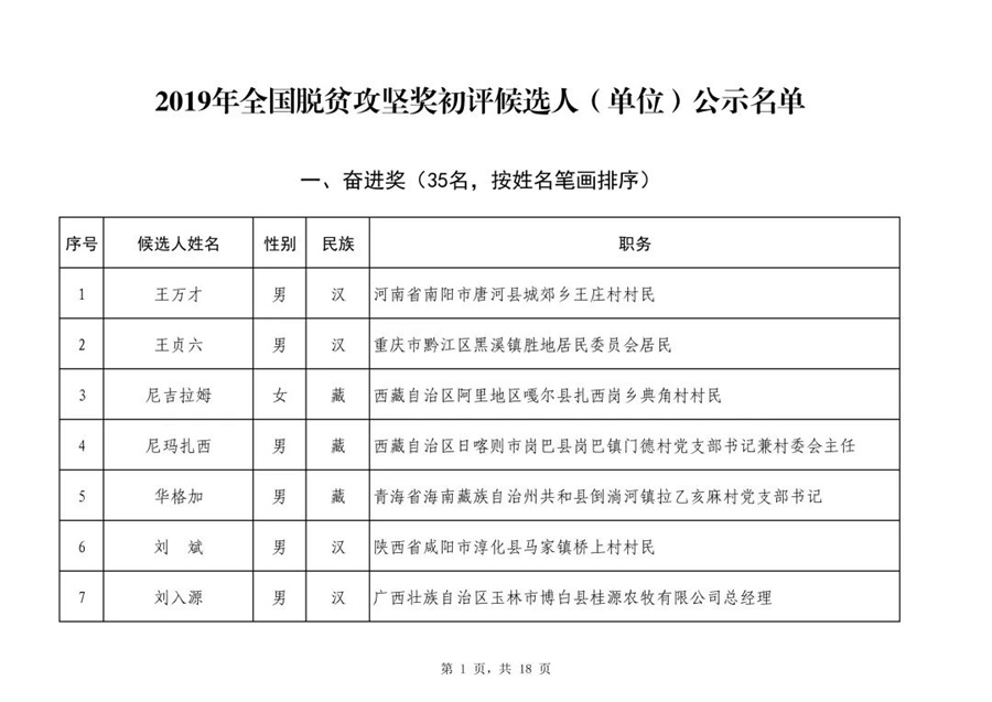 2019年全國脫貧攻堅獎初評候選人(單位)公示公告-新華網(wǎng)