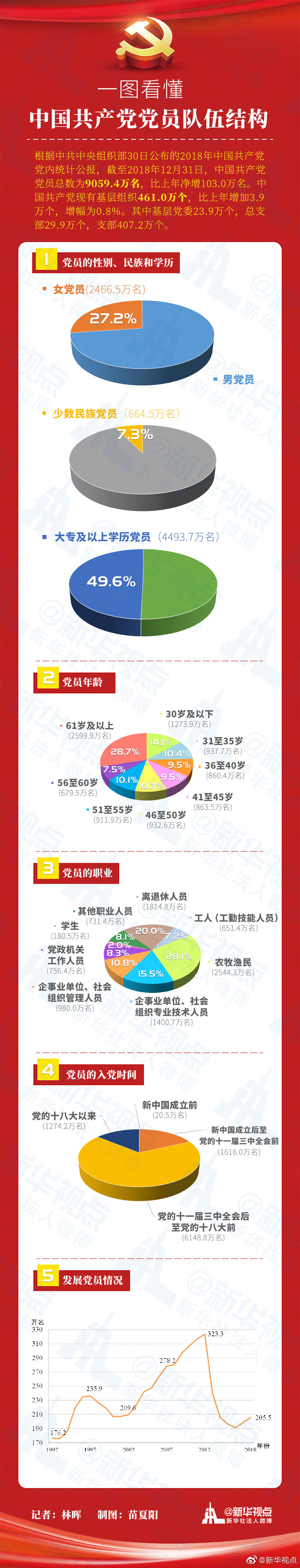 根據(jù)中共中央組織部30日公布的2018年中國共產(chǎn)黨黨內(nèi)統(tǒng)計(jì)公報(bào),截至2018年12月31日,中國共產(chǎn)黨黨員總數(shù)為9059.4萬名。想了解黨員的性別比例、學(xué)歷情況、職業(yè)分布……戳圖? ????