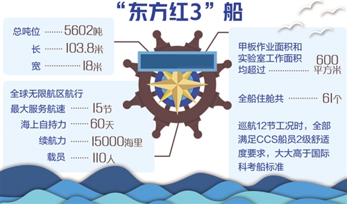 “東方紅3”船是一艘5000噸級(jí)新型深遠(yuǎn)海綜合科學(xué)考察船,以培養(yǎng)深海大洋創(chuàng)新型人才為首要任務(wù),融合科學(xué)研究、科學(xué)考察、高新技術(shù)研發(fā)應(yīng)用為一體。該船總長(zhǎng)103.8米、寬18米,海上自持力長(zhǎng)達(dá)60天,可連續(xù)航行1.5萬(wàn)海里;載員110人,甲板作業(yè)面積和實(shí)驗(yàn)室工作面積均超過(guò)600平方米。該船是目前世界上最安靜,定員最多,經(jīng)濟(jì)性、振動(dòng)噪聲、電磁兼容等指標(biāo)要求最高,作業(yè)甲板和實(shí)驗(yàn)室面積利用率最大、綜合科考功能最完備的新一代海洋綜合科考船。