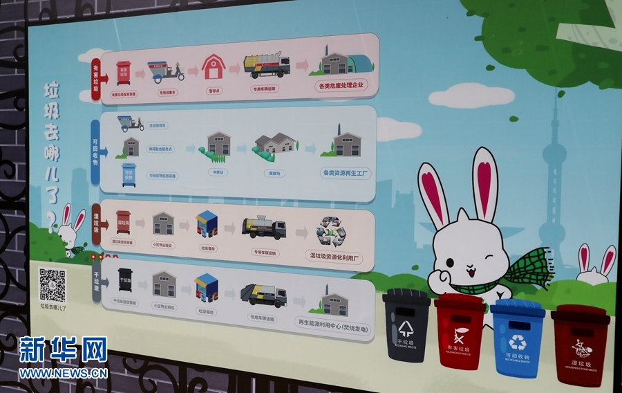 在虹口區(qū)嘉興路街道“宇泰景苑”小區(qū)內(nèi),小區(qū)垃圾房外的裝飾墻上對分類后不同垃圾的去向進行詳解(6月24日攝)。 新華社記者 方喆 攝