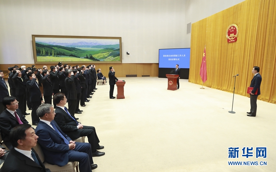 根據(jù)《中華人民共和國(guó)憲法》和《國(guó)務(wù)院及其各部門(mén)任命的國(guó)家工作人員憲法宣誓組織辦法》,2018年11月至2019年6月國(guó)務(wù)院任命的25個(gè)部門(mén)和單位的28名負(fù)責(zé)人依法進(jìn)行憲法宣誓。