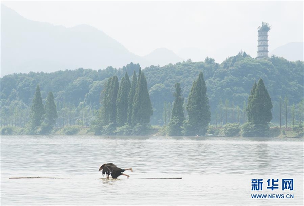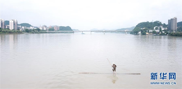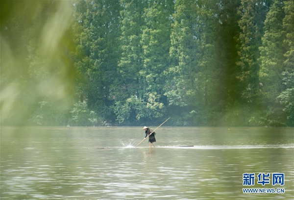 新華社杭州7月11日電(記者商意盈) 江面浩渺,霧氣氤氳。11日上午,浙江新安江上,一根大約8米長(zhǎng)的毛竹越江而來,毛竹上站立著一位身穿蓑衣、頭戴斗笠的精瘦男子。他用手中的細(xì)竹竿作槳,輕輕劃水,不多時(shí),人已到江心。