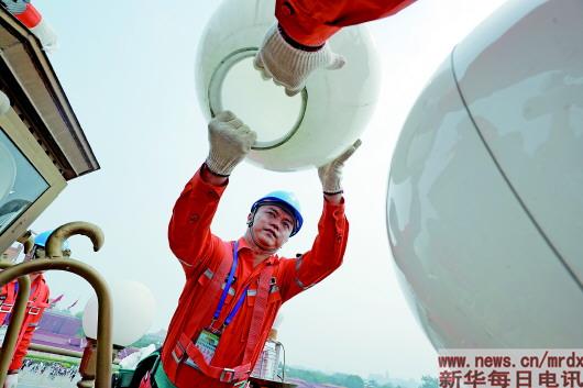 升降車抬起,卸下燈球、高壓氣槍清除污物、檢查線路和器件、清洗燈球、安裝燈泡……華燈班隊(duì)員們動(dòng)作嫻熟、配合默契,儼然一條空中的流動(dòng)生產(chǎn)線。
