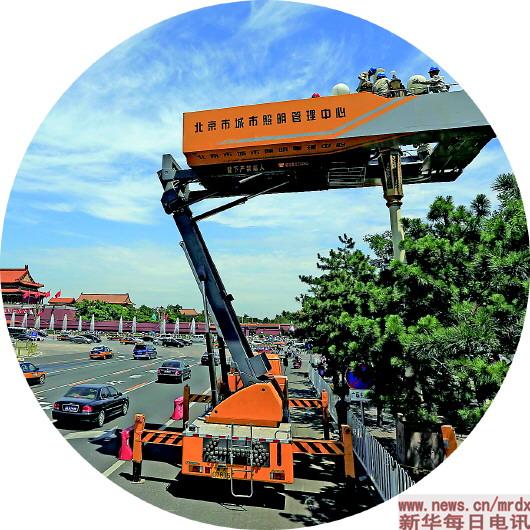 56攝氏度!這是長安街華燈作業(yè)車上的溫度。7月的北京熱浪襲人,下午2點(diǎn),記者來到天安門廣場東側(cè)的華燈下,國家電網(wǎng)北京電力華燈班的第五任班長陳春光,正在和隊(duì)員們進(jìn)行當(dāng)天第10基華燈的清洗工作。當(dāng)天,天安門廣場的地面溫度達(dá)到50攝氏度。