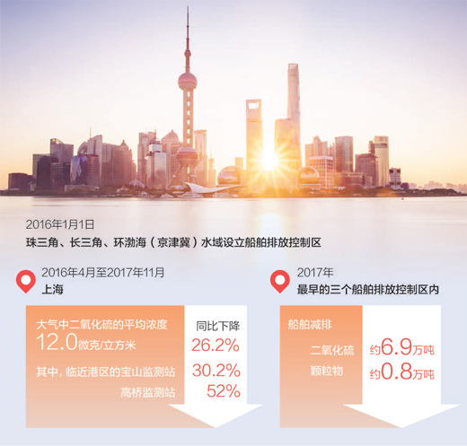 限硫帶來(lái)了空氣質(zhì)量的持續(xù)向好。在上海,2016年4月至2017年11月期間,大氣中二氧化硫的平均濃度為12.0微克/立方米,同比下降26.2%。其中,臨近港區(qū)的寶山監(jiān)測(cè)站、高橋監(jiān)測(cè)站的二氧化硫濃度同比分別下降30.2%、52%。深圳東部港區(qū)、京唐港等控制區(qū)內(nèi)的監(jiān)測(cè)數(shù)據(jù)也顯示,港口硫氧化物降幅十分明顯。