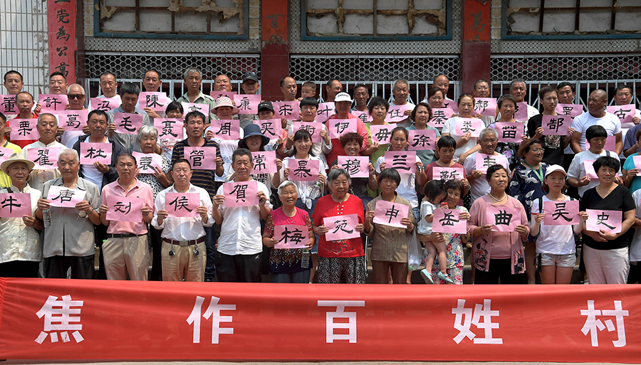 百間房村每個(gè)姓氏的代表在拍攝“全家?!保?月26日攝)。? 新華社記者李安攝