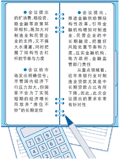 中共中央政治局會議提出,推進(jìn)金融供給側(cè)結(jié)構(gòu)性改革,引導(dǎo)金融機構(gòu)增加對制造業(yè)、民營企業(yè)的中長期融資,把握好風(fēng)險處置節(jié)奏和力度,壓實金融機構(gòu)、地方政府、金融監(jiān)管部門責(zé)任。