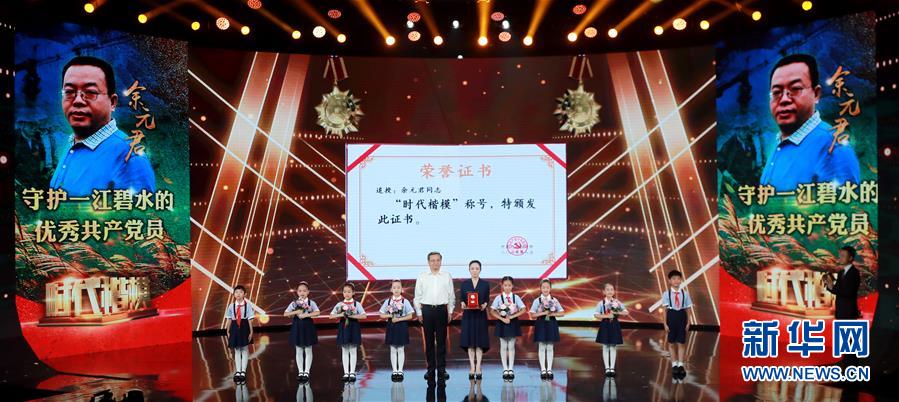 余元君的妻子黃宇代余元君領(lǐng)取“時(shí)代楷?!豹?jiǎng)?wù)潞妥C書(8月5日攝)。新華社記者 潘旭 攝