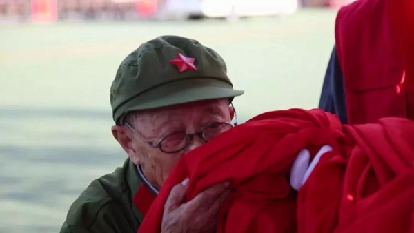官兵們特意為老人展開了一面