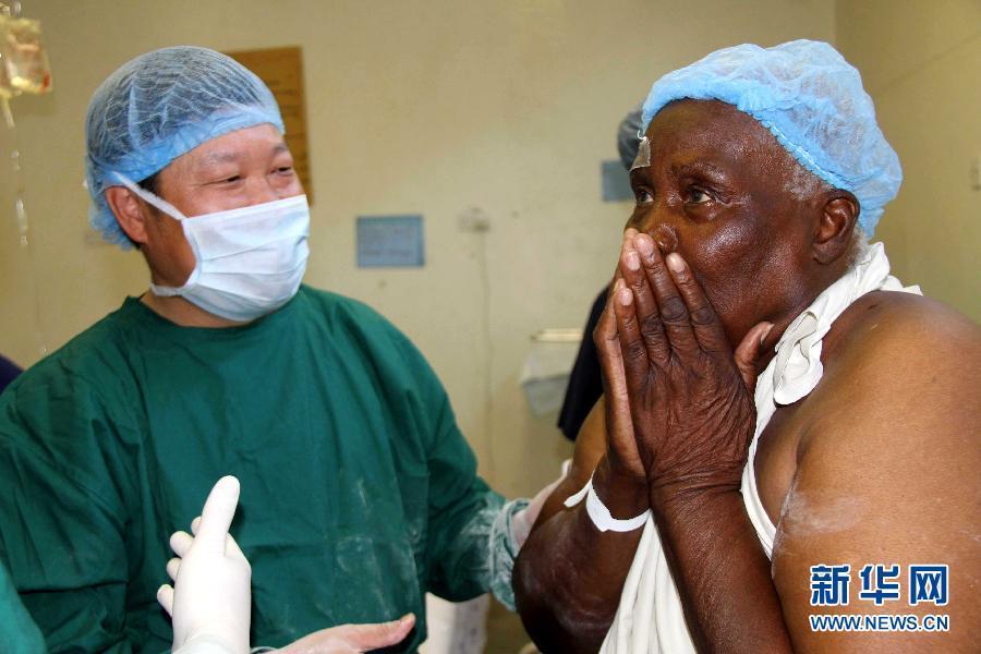 2010年11月23日,在津巴布韋首都哈拉雷郊區(qū)的奇通圭扎中心醫(yī)院,一位老人(右)在中國“非洲光明行”醫(yī)療隊(duì)為其實(shí)施復(fù)明手術(shù)后重見光明,驚喜萬分。 新華社記者 李平 攝