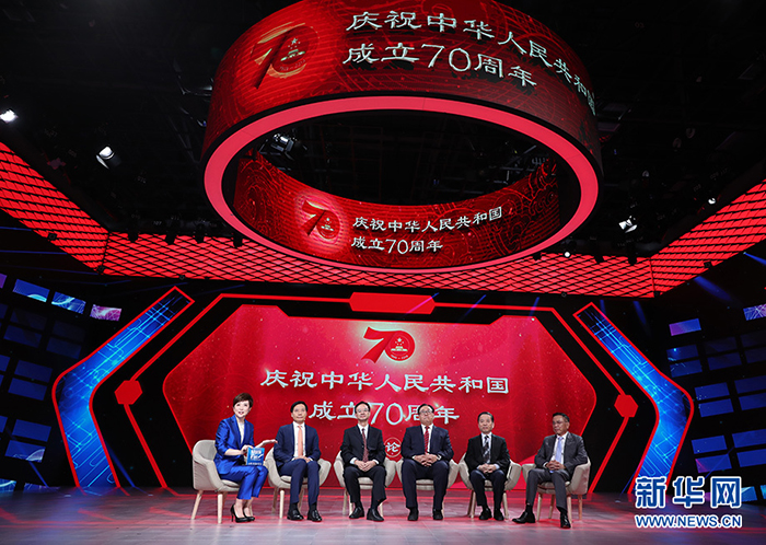 8月22日上午,由中央宣傳部、中央和國家機關(guān)工委、中央軍委政治工作部、北京市委聯(lián)合主辦,人民網(wǎng)、新華網(wǎng)、央視網(wǎng)承辦的慶祝中華人民共和國成立70周年系列論壇第二場在新華網(wǎng)媒體創(chuàng)意工場MR智能演播室舉行。圖為企業(yè)家與網(wǎng)友互動。新華網(wǎng) 焦鵬 攝