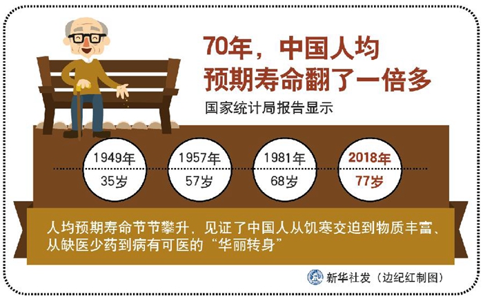 國(guó)家統(tǒng)計(jì)局報(bào)告顯示,1949年35歲,1957年57歲,1981年68歲,2018年77歲——人均預(yù)期壽命節(jié)節(jié)攀升,見證了中國(guó)人從饑寒交迫到物質(zhì)豐富、從缺醫(yī)少藥到病有可醫(yī)的“華麗轉(zhuǎn)身”——