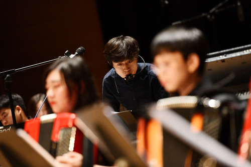 6月16日,在天津大劇院,樂團成員李宏基(中)用電子呼吸控制器演奏曲目。 李然 攝