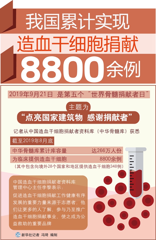 新華社西安9月21日電(記者藺娟 吳鴻波)記者從中國造血干細(xì)胞捐獻(xiàn)者資料庫(中華骨髓庫)獲悉,截至2019年8月底,中華骨髓庫累計(jì)庫容量已達(dá)266萬人份,為臨床提供造血干細(xì)胞8800余例,其中包含向境外28個國家和地區(qū)提供造血干細(xì)胞348例。