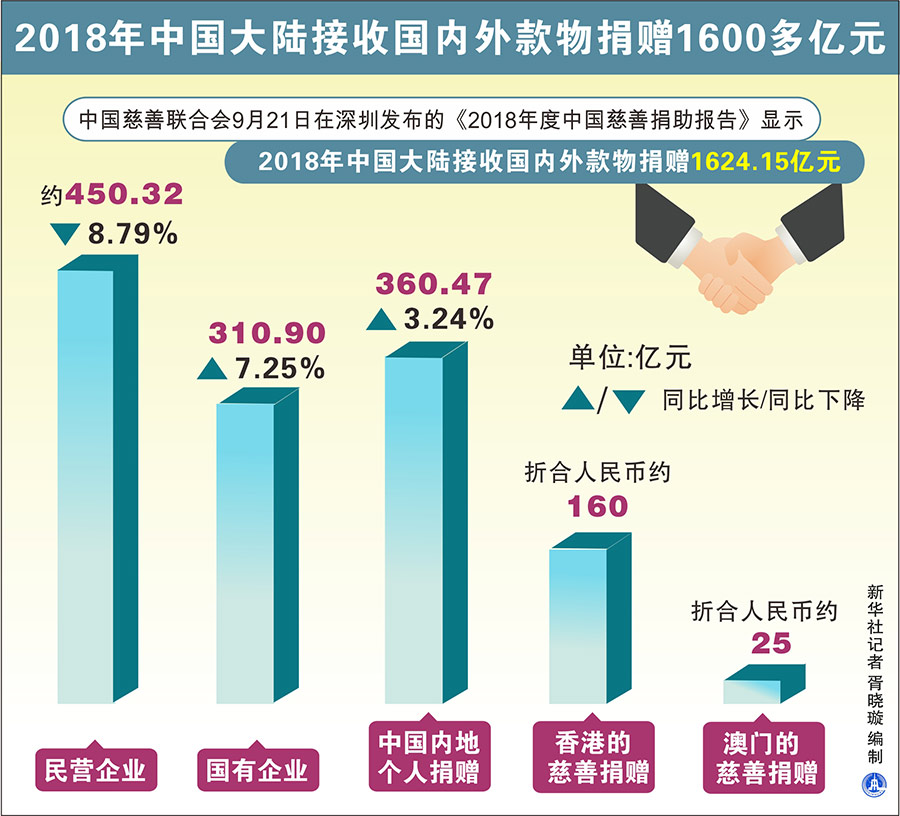 新華社深圳9月21日電(記者王豐、李曉玲)中國慈善聯(lián)合會21日在深圳發(fā)布的《2018年度中國慈善捐助報(bào)告》顯示,2018年中國大陸接收國內(nèi)外款物捐贈1624.15億元。