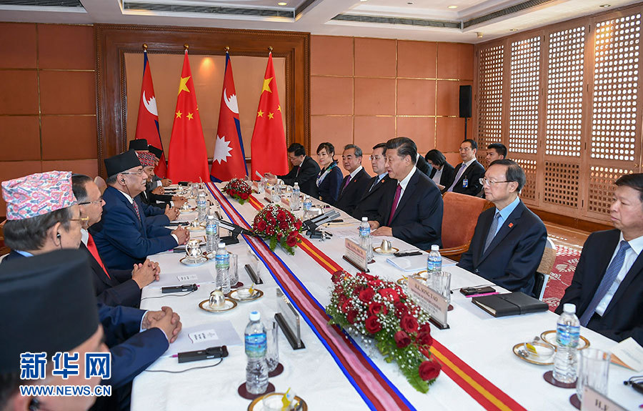 10月13日,國(guó)家主席習(xí)近平在加德滿(mǎn)都下榻飯店會(huì)見(jiàn)尼泊爾共產(chǎn)黨聯(lián)合主席普拉昌達(dá)。 新華社記者 謝環(huán)馳 攝
