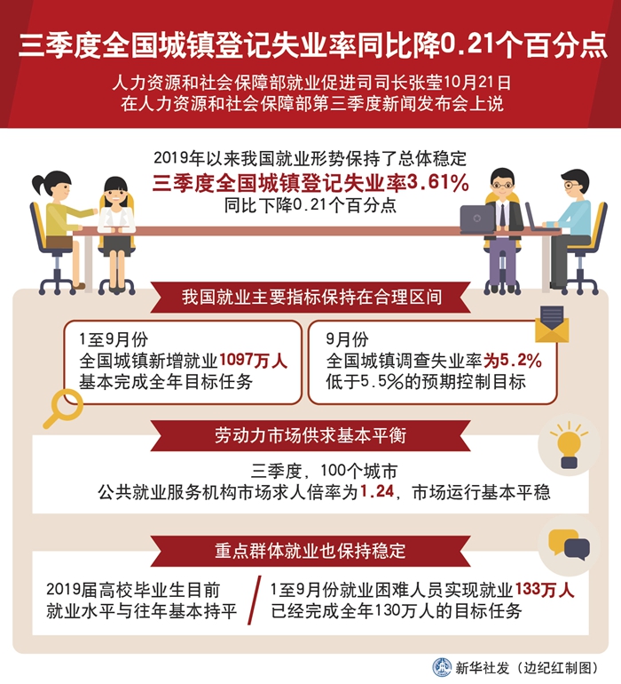 新華社北京10月21日電(記者王優(yōu)玲)人力資源和社會保障部就業(yè)促進(jìn)司司長張瑩21日說,今年以來我國就業(yè)形勢保持了總體穩(wěn)定,三季度全國城鎮(zhèn)登記失業(yè)率3.61%,同比下降0.21個百分點(diǎn)。