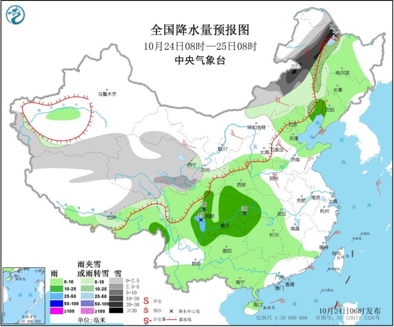 冷空氣不僅制造降溫,今明兩天還會(huì)給東北、華北等地制造雨雪天氣,同時(shí)華西地區(qū)的陰雨也將延綿不絕。中央氣象臺(tái)預(yù)計(jì),10月24日08時(shí)至25日08時(shí),黑龍江西部、內(nèi)蒙古中東部、甘肅南部、青海、西藏東部等地的部分地區(qū)有小到中雪或雨夾雪,其中內(nèi)蒙古中部偏北和東北部、黑龍江西北部等地有大雪,局地暴雪或大暴雪;遼寧西南部、西南地區(qū)東部、湖北西南部、湖南西北部等地的部分地區(qū)有中雨,局地大雨(25~45毫米)。
