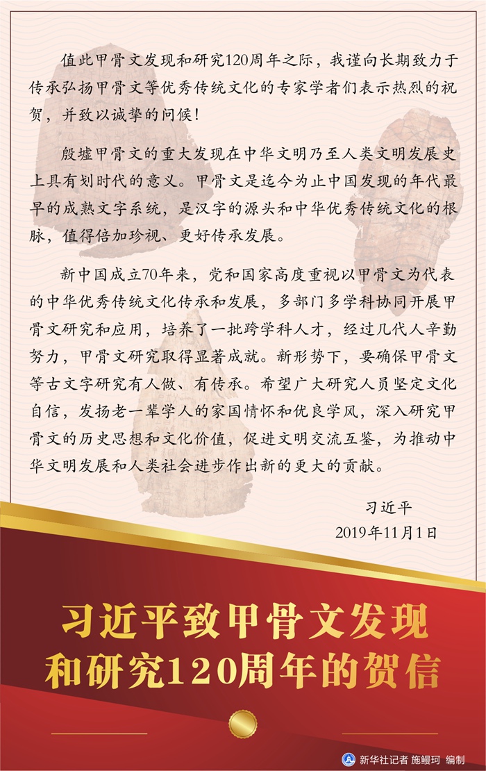 習(xí)近平致甲骨文發(fā)現(xiàn)和研究120周年的賀信 新華社記者 施鰻珂 編制
