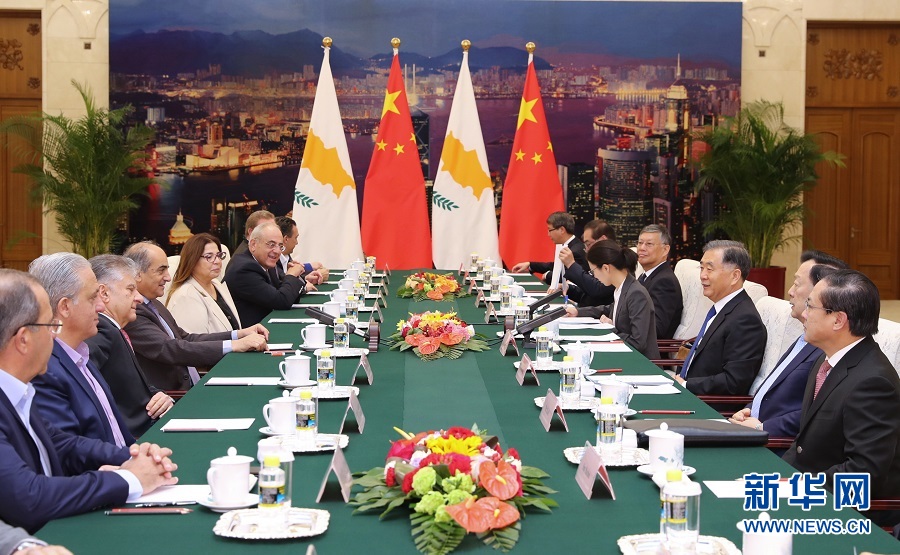 11月8日,全國(guó)政協(xié)主席汪洋在北京人民大會(huì)堂會(huì)見塞浦路斯議長(zhǎng)西盧里斯?!⌒氯A社記者 鞠鵬 攝
